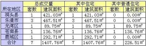 3月1日溫州市各縣市成交商品房7套,成交建筑面積1407.76㎡。主城區成交房產2套,包括鹿城銀都花園8號和萬科龍灣花園(潤園)各1套住宅。樂清晨沐花園成交3套住宅,成交面積467.51㎡。蒼南天和家園成交1套住宅,洞頭三盤領海成交1套別墅。